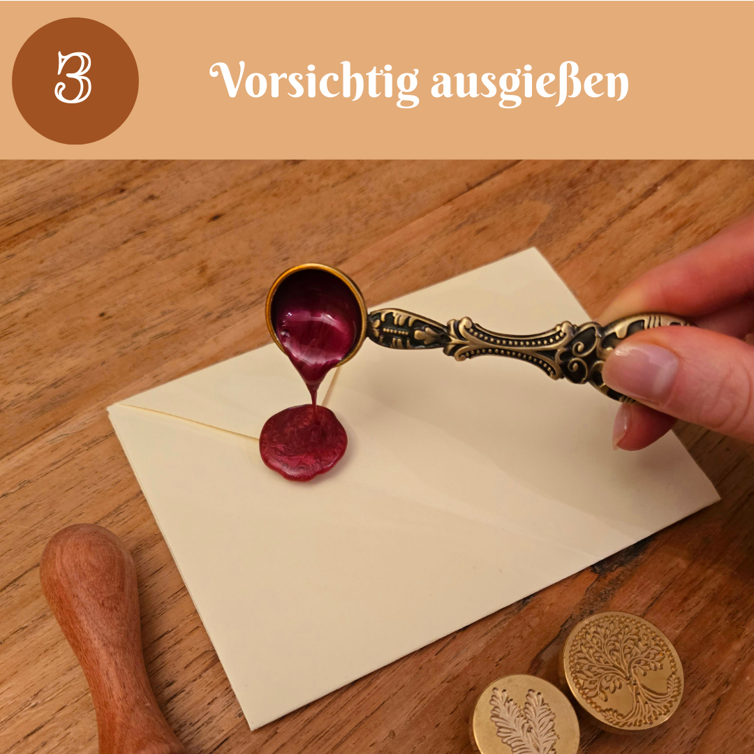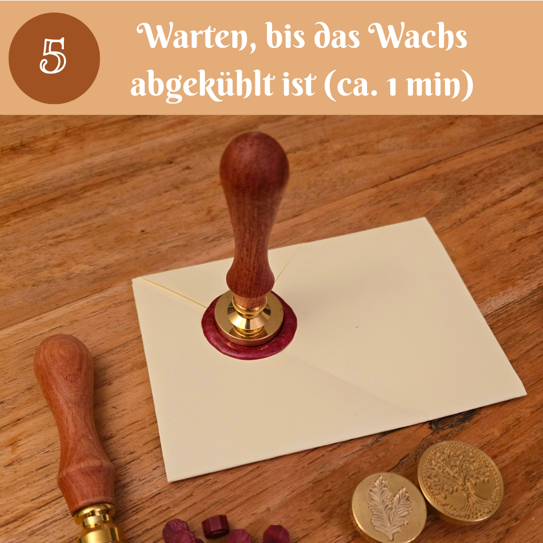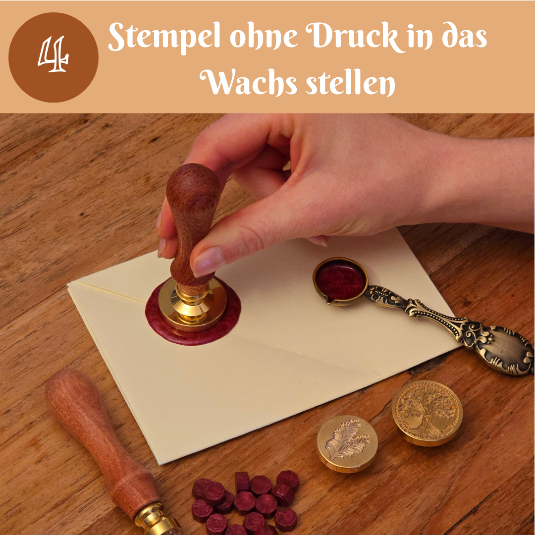 Der Wachsabdruck auf den Bildern dient nur der Darstellung des Stempelergebnisses. Wie auch die Dekoration ist er nicht im Lieferumfang enthalten. Zum Glück kannst du dann ja eigene Wachssiegel herstellen.