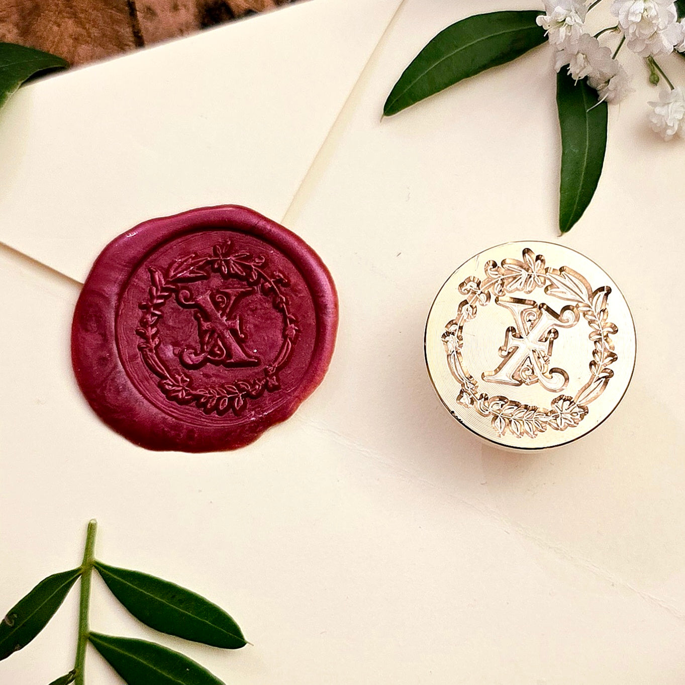 Siegelstempel "X - Buchstabensiegel mit Blütenkranz" aus Messing, SKU: SIG-05-X